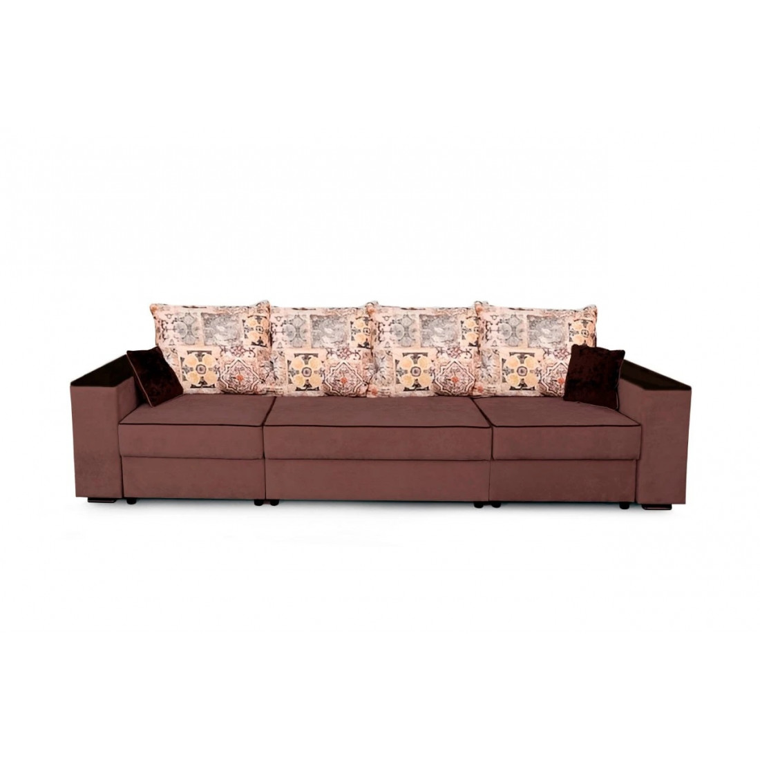 С одной стороны расположена боковина с нишей, с другой – ящики. Надежные петли с доводчиками добавляют комфортности использования мебели. Диван-трансформер может быть прямым, угловым и П-образным. Малые декоративные подушки входят в комплект дивана.