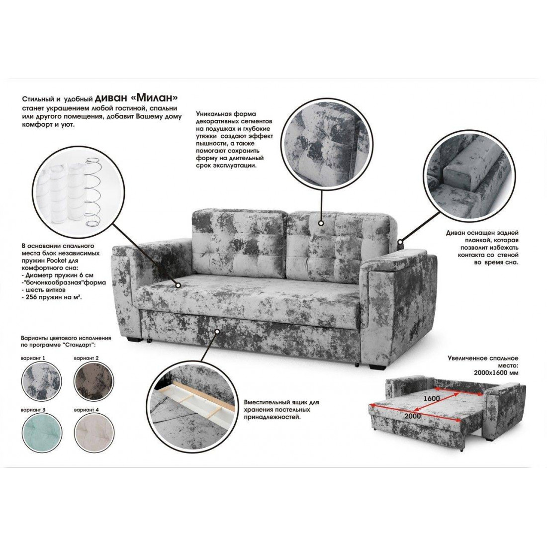 Диван оснащен задней планкой, которая позволит избежать контакта со стеной во время сна.