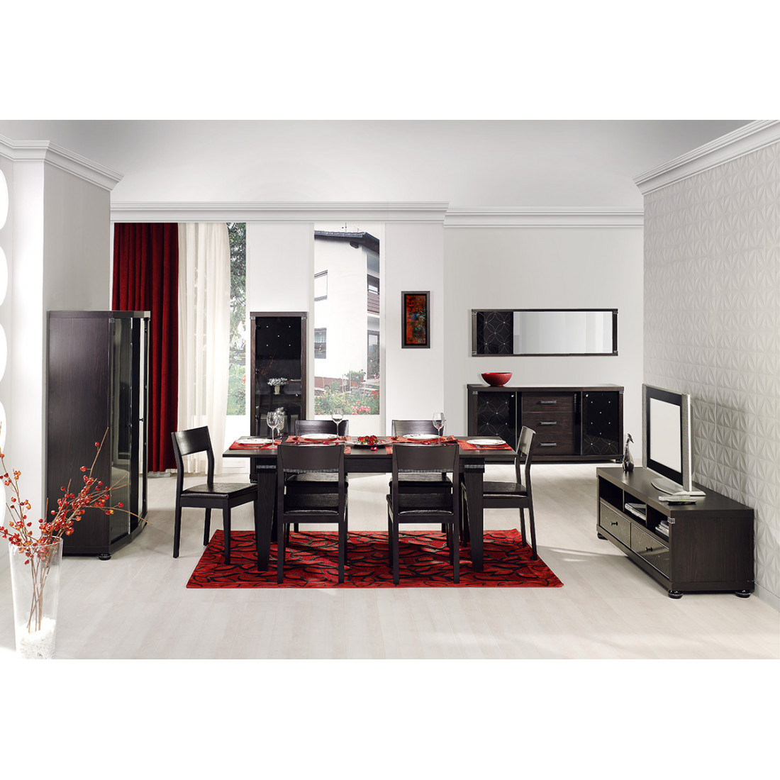 Предлагаем купить базовый комплект для обстановки просторной гостиной в стиле Мира по сниженной цене. Он включает в себя следующие позиции: удлиненную тумбу под телевизор, шкаф-витрину и обеденную зону, состоящую из четырех стульев и раздвижного обеденного стола со столешницей достаточной длины и ширина для комфортного расположения восьмерых человек. По своему усмотрению вы можете дополнить композицию другими модулями коллекции или составить свою, «с нуля».