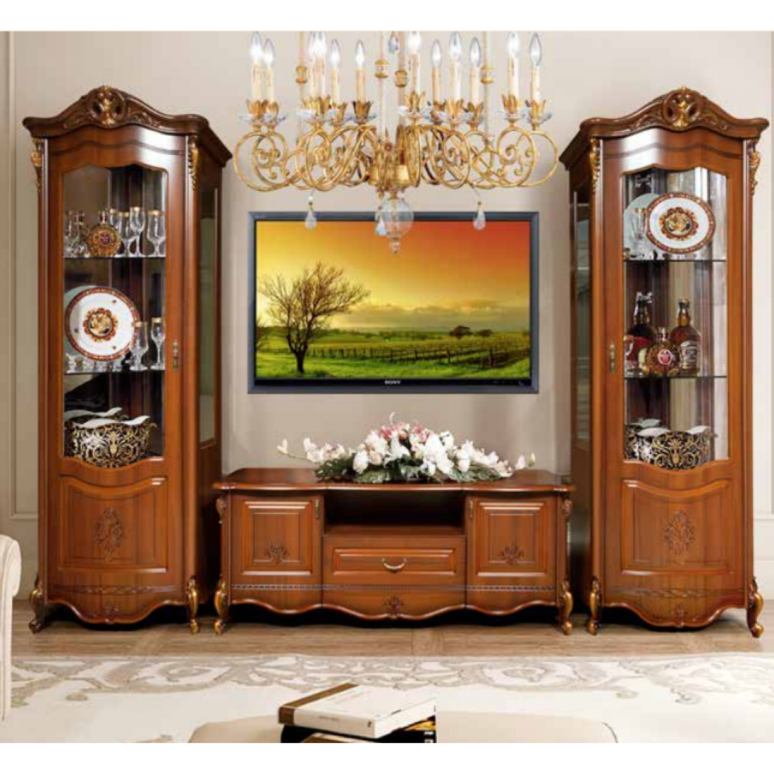Гостиная Аллегро (орех) – данная модель сделает вашу гостиную неповторимой и нарядной. Гостиная в классическом стиле выглядит уютно и респектабельно, она призывает устроиться поудобнее и расслабиться в компании надежных друзей. Гостиная считается главной комнатой в квартире или доме. Поэтому дизайну интерьера гостиной часто уделяют основное внимание- ведь это «лицо» вашего дома.