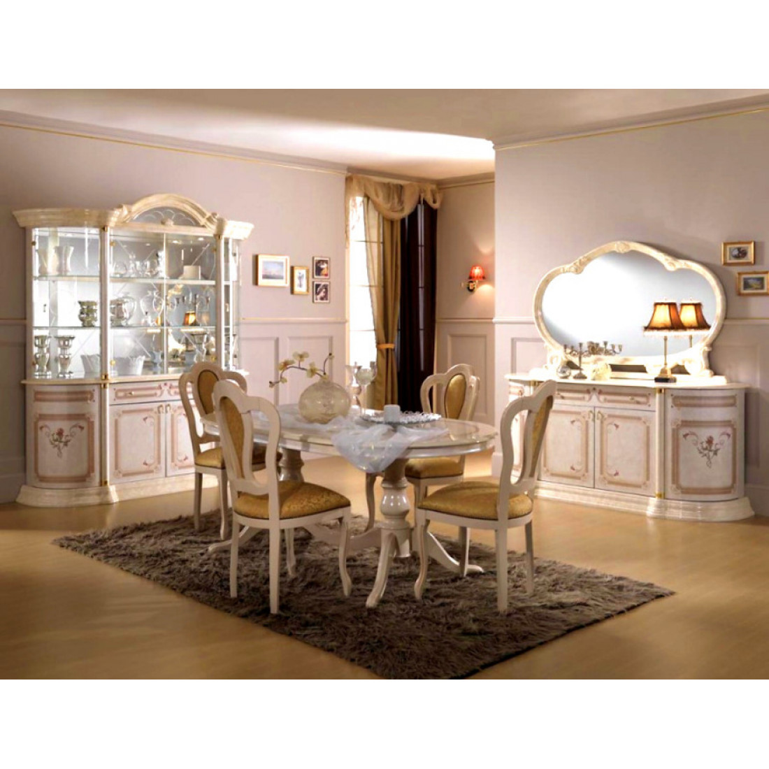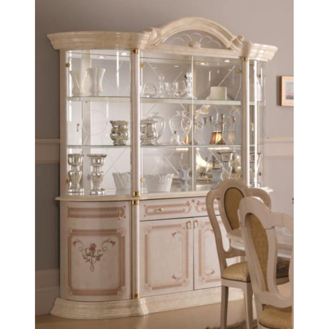 Гостиная Роза (беж) от фабрики ДИА мебель. Вся композиция выполнена в классическом стиле. Бежевый цвет в сочетании с глянцевым покрытием придает этой модели изящность и элегантность. Золотистый орнамент и аккуратные золотистые ручки на фасаде придадут чувства стиля. Мягкие и комфортные стулья помогут вам насладиться прекрасным вечером, после рабочего дня.
