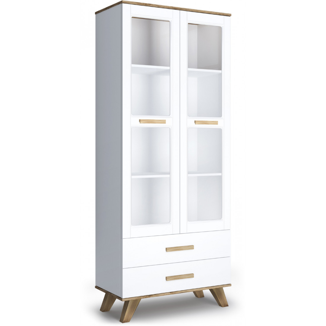 Витрины с прозрачным стеклом и многофункциональный комод в скандинавском стиле. Витрины позволят хранить посуду, книги и другие вещи. В нижней части шкафов-витрин предусмотрены выдвижные ящики. В центральной части композиции стоит большой комод - это вместительный элемент гостиной с ящиками и дверцами, который служит для размещения различных элементов, а так же телевизора. набор мебели представлен в исполнении ЛДСП «Дуб каньон» + «белый», фасады - МДФ в пленке ПВХ «глянец белый».