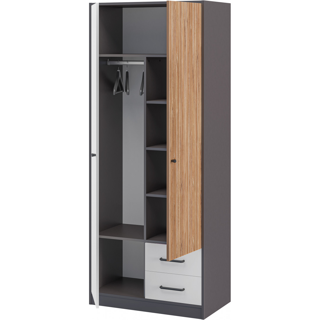 Цветовая палитра коллекции Мальма: белый, графит, Дуб Стирлинг. Спокойные оттенки мебели станут прекрасным фоном для ярких аксессуаров и вещей, помогут избежать лишнего визуального шума в интерьере.