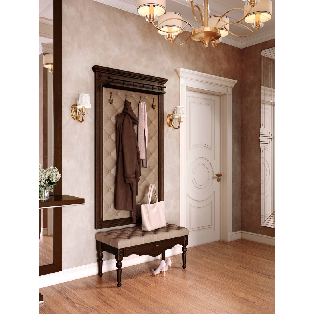 Классическая прихожая Лилль от Мебельград - для ценителей элегантности из массива дерева. Мягкая обивка выполнена популярной на протяжении многих веков каретной стяжкой.